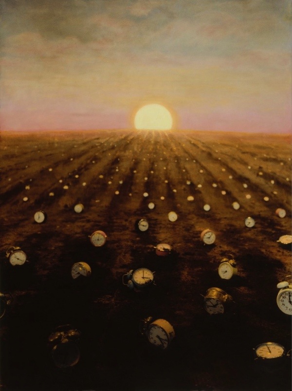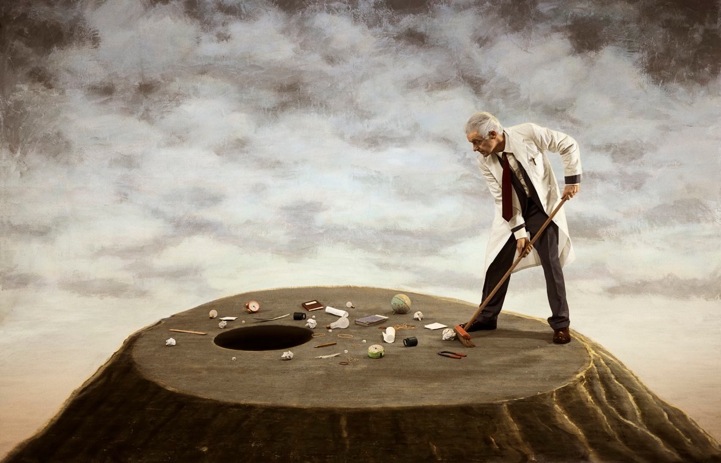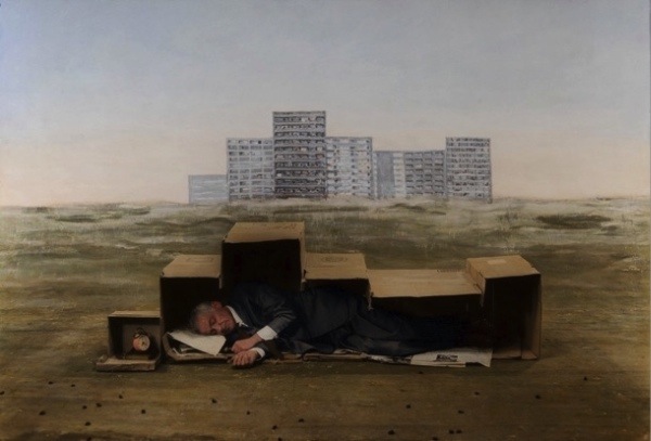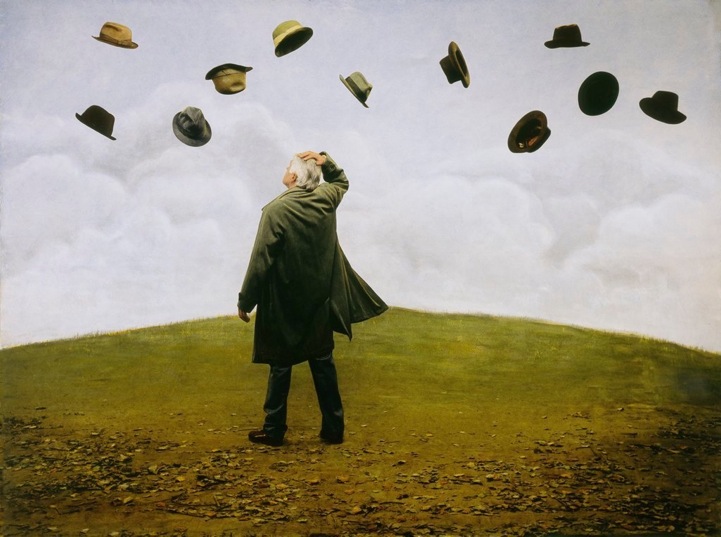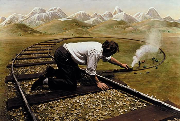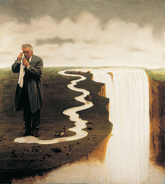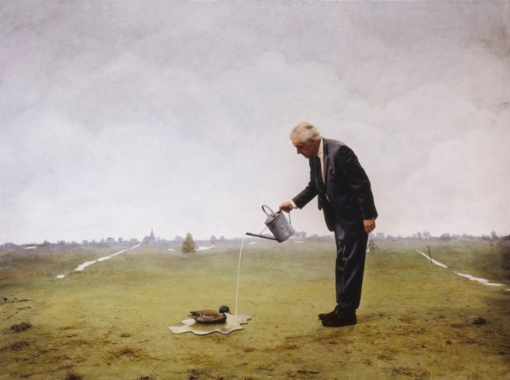 Teun Hocks的作圖的方式結合了自身的跨領域專長-繪畫與攝影,同時也相當的"搞剛"。他會先自拍一張黑白照片,然後放大,再將顏料塗上去,因此透過顏料其 實可以看到是照片做為底圖。Teun Hocks不僅自己是畫中的主角,更延伸出天馬行空的幻想,描繪出一幅又一幅的超現實場景。